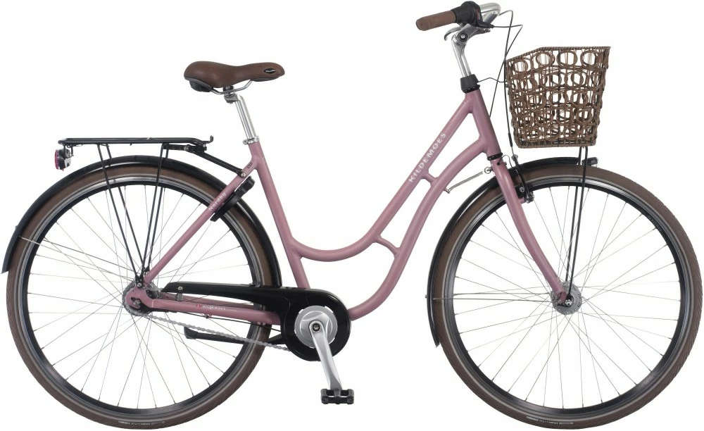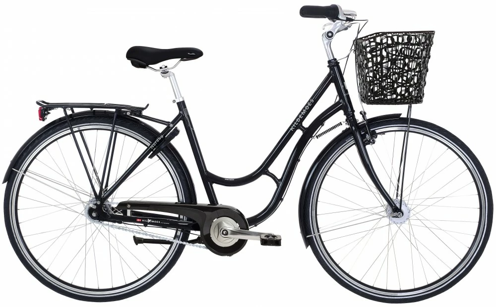 Kildemoes City Nordby shopping damecykel med dynamo forlygte og fastmonteret frontkurv i stål. Der sidder 7 indvendige Shimano Nexus gear samt fodbremse og en v-bremse på forhjulet.