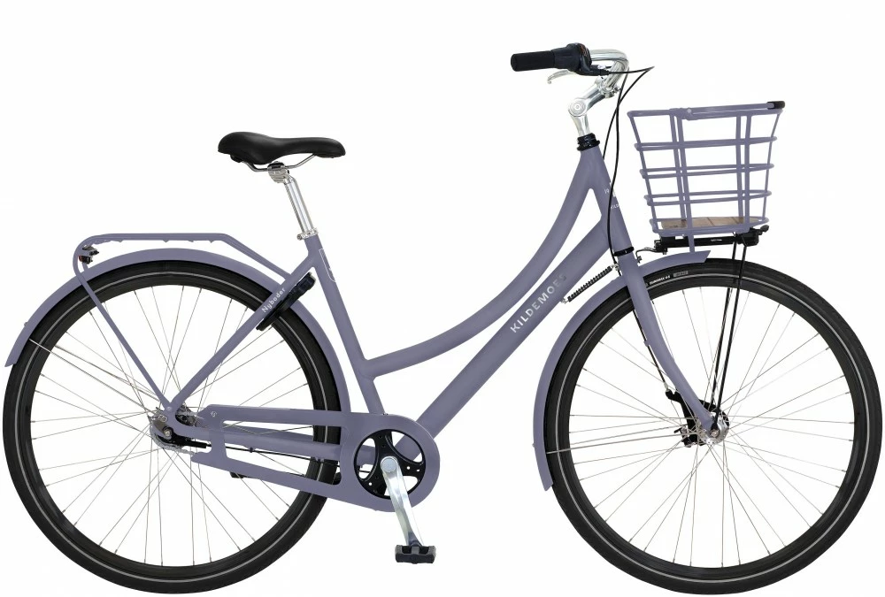 Kildemoes City Nyboder shopping damecykel med indfarvet aftagelig aluminiums click frontkurv. Der sidder 7 indvendige Shimano Nexus gear samt fodbremse og en rullebremse på forhjulet.